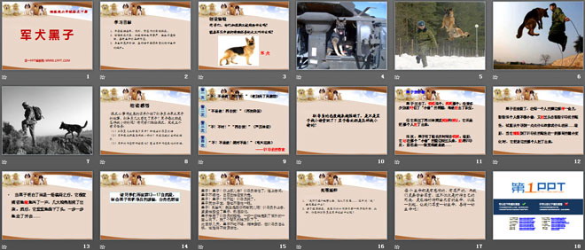 关键词:军犬黑子教学课件,湘教版六年级下册语文PPT课件下载,六年级语文幻灯片课件下载,军犬黑子PPT课件下载,.PPT格式;