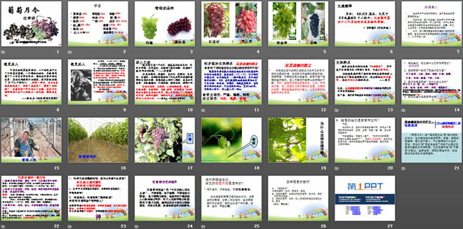 关键词:葡萄月令教学课件,湘教版六年级下册语文PPT课件下载,六年级语文幻灯片课件下载,葡萄月令PPT课件下载,.PPT格式;