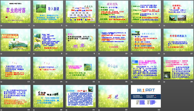 关键词:草虫的村落教学课件,湘教版六年级下册语文PPT课件下载,六年级语文幻灯片课件下载,草虫的村落PPT课件下载,.PPT格式;
