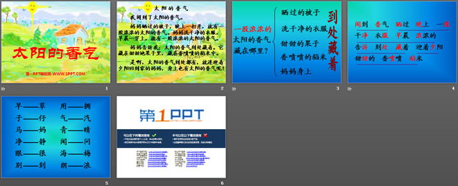 关键词:太阳的香气教学课件,冀教版一年级上册语文PPT课件下载,一年级语文幻灯片课件下载,太阳的香气PPT课件下载,.PPT格式;