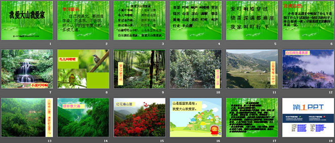 关键词:我爱大山我爱家教学课件,冀教版一年级下册语文PPT课件下载,一年级语文幻灯片课件下载,我爱大山我爱家PPT课件下载,.PPT格式;