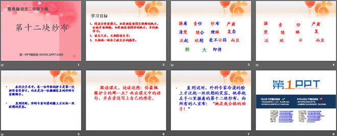 关键词:第十二块纱布教学课件,冀教版二年级下册语文PPT课件下载,二年级语文幻灯片课件下载,第十二块纱布PPT课件下载,.PPT格式;