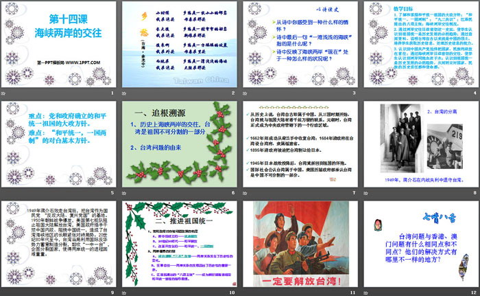 2.通过两岸交往日益密切这一史实,使学生认识到祖国统一是历史发展的必然趋势;通过查阅资料,说明台湾自古以来就是中国的领土,培养学生获取历史信息、处理历史信息的能力。