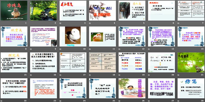 关键词:珍珠鸟教学课件,冀教版五年级上册语文PPT课件下载,五年级语文幻灯片课件下载,珍珠鸟PPT课件下载,.PPT格式;