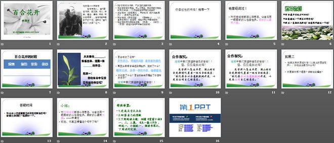 关键词:百合花开教学课件,冀教版六年级上册语文PPT课件下载,六年级语文幻灯片课件下载,百合花开PPT课件下载,.PPT格式;