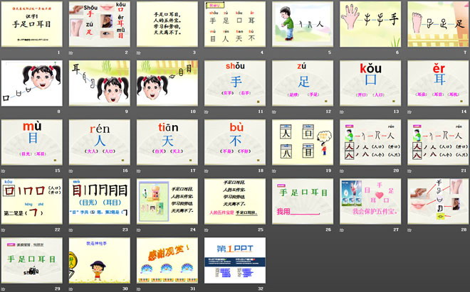 关键词:手足口耳目教学课件,语文S版一年级上册语文课件,一年级语文幻灯片课件下载,手足口耳目PPT课件下载,.ppt格式