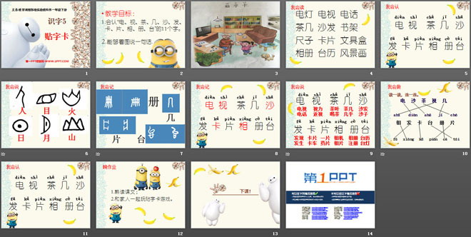 1.会认“电、视、茶、几、沙、发、卡、片、相、册、台”的11个字。