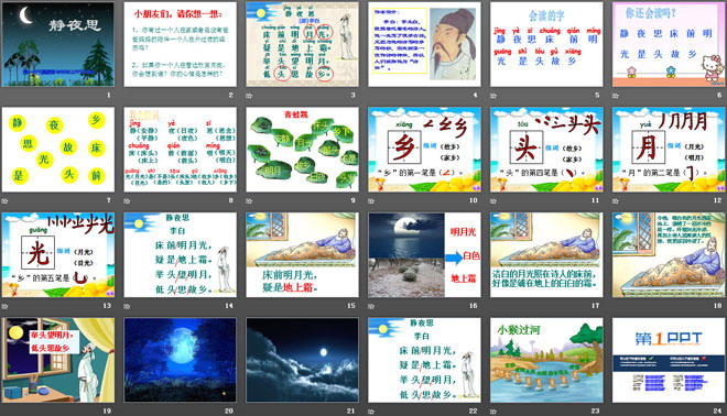 关键词:静夜思教学课件,语文S版一年级上册语文课件,一年级语文幻灯片课件下载,静夜思PPT课件下载,.ppt格式