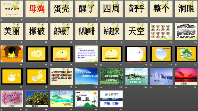2、小鸡用小尖嘴啄鸡蛋壳。他啄呀啄呀,啄出一个小小的洞眼。他看见天空是蓝湛湛的,树木是绿茵茵的,小河是碧澄澄的。原来世界这么美丽呀!小鸡高兴极了。他用力一撑,就把蛋壳撑破了。他叽叽叽地叫着,慢慢地站了起来。