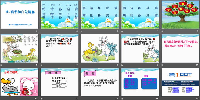 关键词:鸭子和白兔请客教学课件,语文S版一年级下册语文课件,一年级语文幻灯片课件下载,鸭子和白兔请客PPT课件下载,.ppt格式