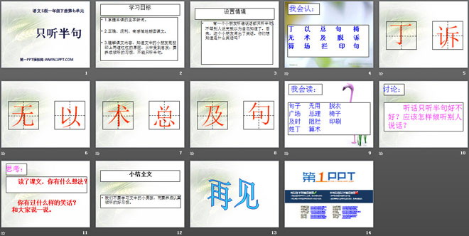 关键词:只听半句教学课件,语文S版一年级下册语文课件,一年级语文幻灯片课件下载,只听半句PPT课件下载,.ppt格式