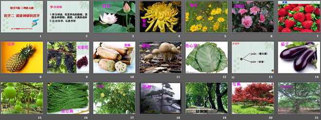 1.学习词语,引发学生的联想。掌握各种植物、蔬菜、水果的名称
