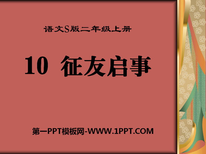 关键词:征友启事教学课件,语文S版二年级上册语文课件,二年级语文幻灯片课件下载,征友启事PPT课件下载,.ppt格式