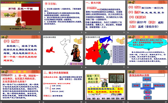 2.掌握秦始皇建立中央集权制度的具体措施,知道秦始皇巩固统一的具体内容。