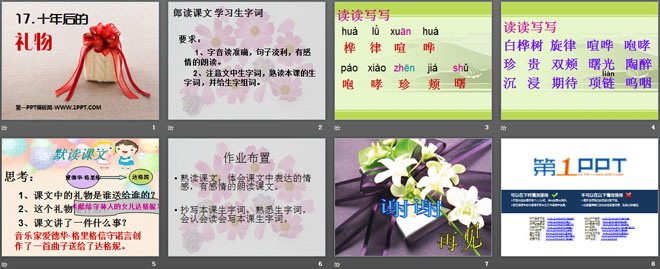 关键词:十年后的礼物教学课件,语文S版五年级上册语文课件,五年级语文幻灯片课件下载,十年后的礼物PPT课件下载,.ppt格式