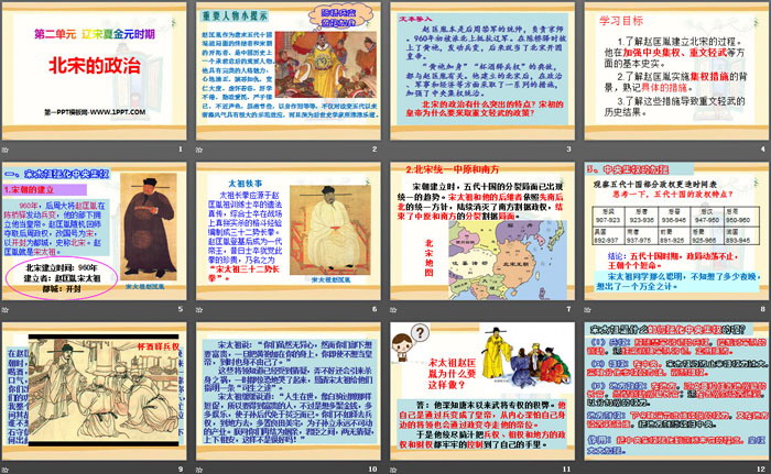 1.了解赵匡胤建立北宋的过程。他在加强中央集权、重文轻武等方面的基本史实。