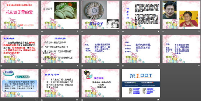 关键词:花边饺子里的爱教学课件,语文S版六年级上册语文课件,六年级语文幻灯片课件下载,花边饺子里的爱PPT课件下载,.ppt格式
