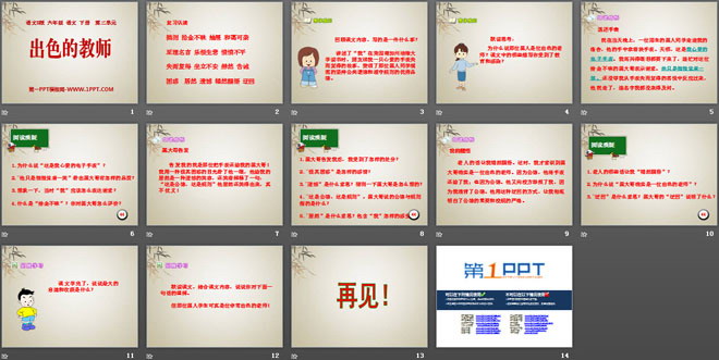 关键词:出色的老师教学课件,语文S版六年级下册语文课件,六年级语文幻灯片课件下载,出色的老师PPT课件下载,.ppt格式