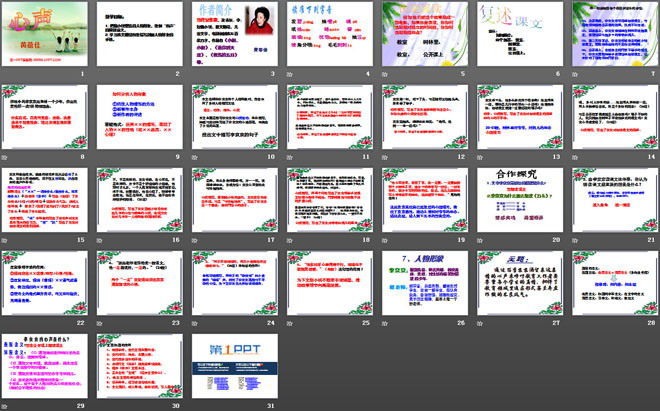 ⑵、回家路上,李京京偷偷地在树林里读起课文,并深情回忆起乡下的爷爷和妮儿。