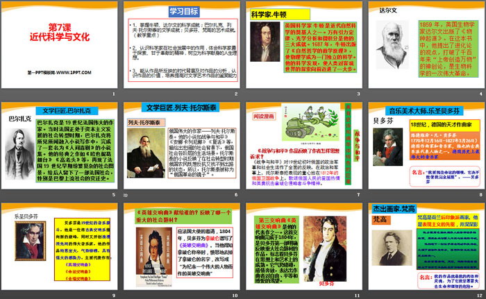 1、掌握牛顿、达尔文的科学成就;巴尔扎克、列夫·托尔斯泰的文学成就;贝多芬、梵高的艺术成就。(教学重点)