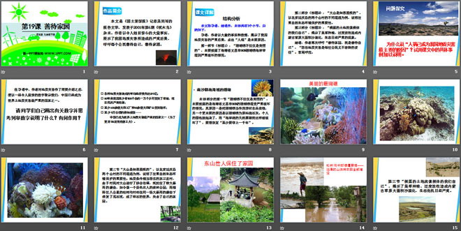 关键词:善待家园教学课件,语文版九年级下册语文课件,九年级语文幻灯片课件下载,善待家园PPT课件下载,.ppt格式