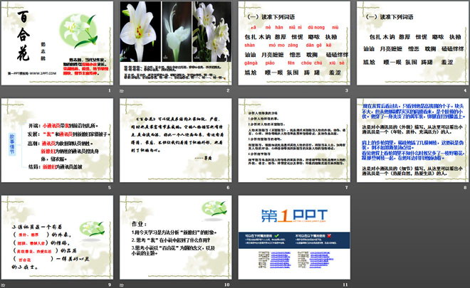 关键词:百合花教学课件,语文版九年级下册语文课件,九年级语文幻灯片课件下载,百合花PPT课件下载,.ppt格式