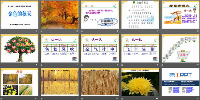 关键词:金色的秋天教学课件,语文A版一年级上册语文课件,一年级语文幻灯片课件下载,金色的秋天PPT课件下载,.ppt格式