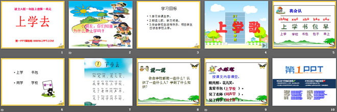关键词:上学去教学课件,语文A版一年级上册语文课件,一年级语文幻灯片课件下载,上学去PPT课件下载,.ppt格式