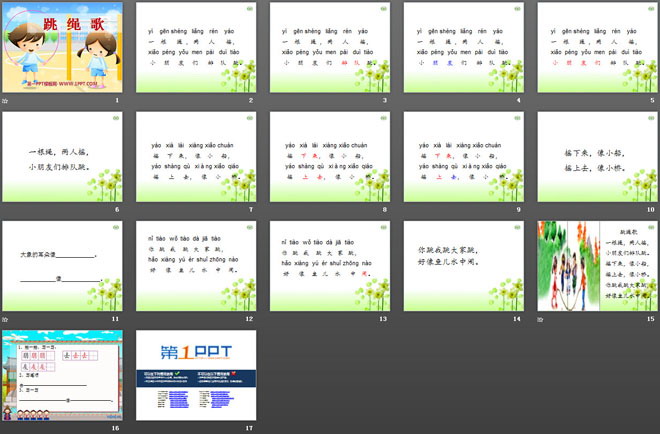 关键词:跳绳歌教学课件,语文A版一年级上册语文课件,一年级语文幻灯片课件下载,跳绳歌PPT课件下载,.ppt格式