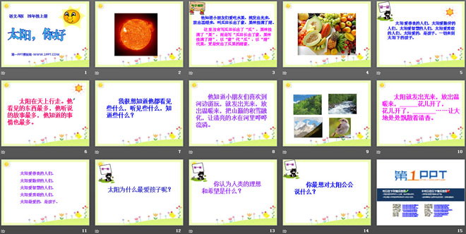 关键词:太阳你好教学课件,语文A版四年级上册语文课件,四年级语文幻灯片课件下载,太阳你好PPT课件下载,.ppt格式