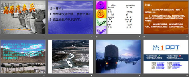 关键词:高原汽车兵教学课件,语文A版五年级上册语文课件,五年级语文幻灯片课件下载,高原汽车兵PPT课件下载,.ppt格式