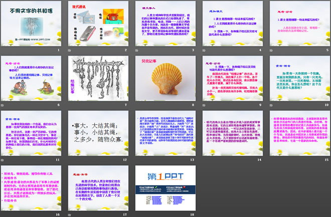 人类文明和科学技术发展到现在,我们的记事和通讯的方式已经很先进了,常见的有书信、电话、网络……人们之间的沟通十分方便。而这些一般都是靠文字或者声音传递的。然而在古代,那时候还没有文字,更不用说有电话等现代通讯设备了,那他们是怎样记事和传递信息的呢?
