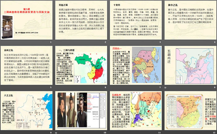 关键词:统编版中外历史纲要上册PPT课件免费下载,三国两晋南北朝的政权更迭与民族交融PPT下载,三国两晋南北朝的民族交融与隋唐统一多民族封建国家的发展PPT下载,.PPT格式;