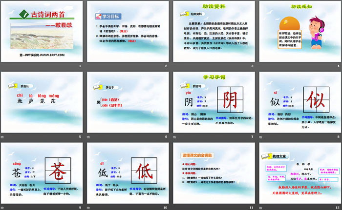1.学会本课的生字,正确、流利、有感情地朗读并背诵《敕勒歌》。(重点)