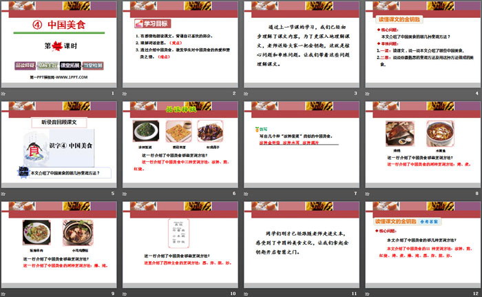 通过本课的识字,让我们了解了11种中国美食及其烹饪方法。让我们在学习汉字的同时增长了知识,并养成爱惜粮食的情感。