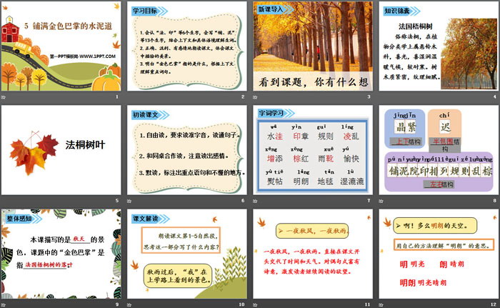 关键词:部编人教版三年级上册语文PPT课件免费下载,铺满金色巴掌的水泥道PPT下载,.PPT格式;