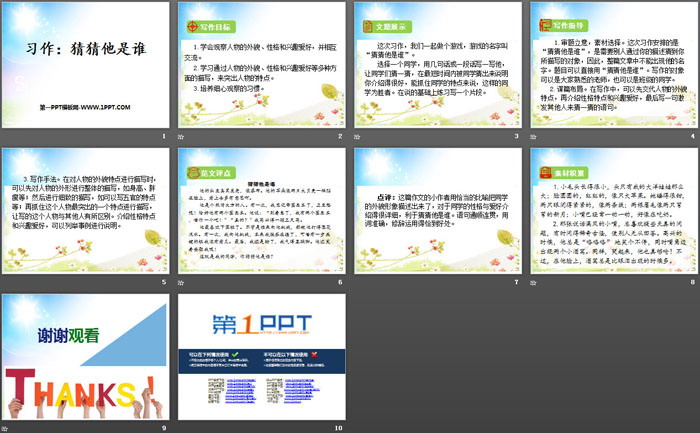 1.审题立意,素材选择。这次习作安排的是“猜猜他是谁”,是需要别人通过你的描述猜到你所描写的对象,因此,整篇文章中不能出现他的名字。题目可以直接用“猜猜他是谁”。写作的对象可以是大家熟悉的老师,也可以是班级的同学。