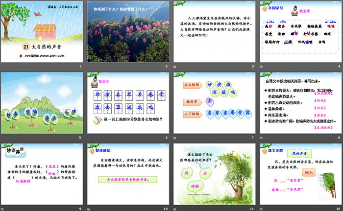 人人都渴望生活在有微风的吹拂、有小溪的流淌、有动物的奔跑的大自然的怀抱中。大自然有哪些美妙的声音呢?让我们走进课文一起去聆听吧!
