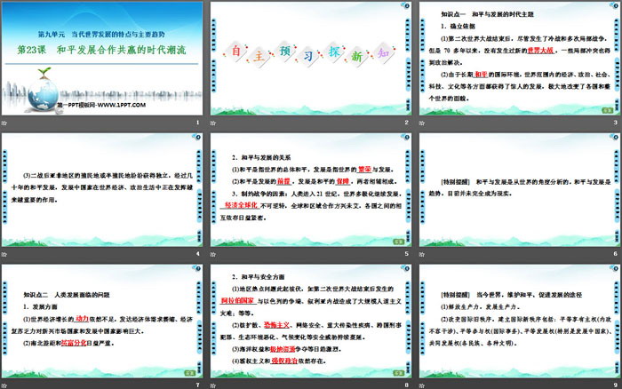 关键词:统编版中外历史纲要下册PPT课件免费下载,和平发展合作共赢的时代潮流PPT下载,20世纪下半叶世界的新变化PPT下载,.PPT格式;