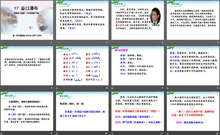 关键词:部编人教版八年级下册语文PPT课件免费下载,壶口瀑布PPT下载,.PPT格式;