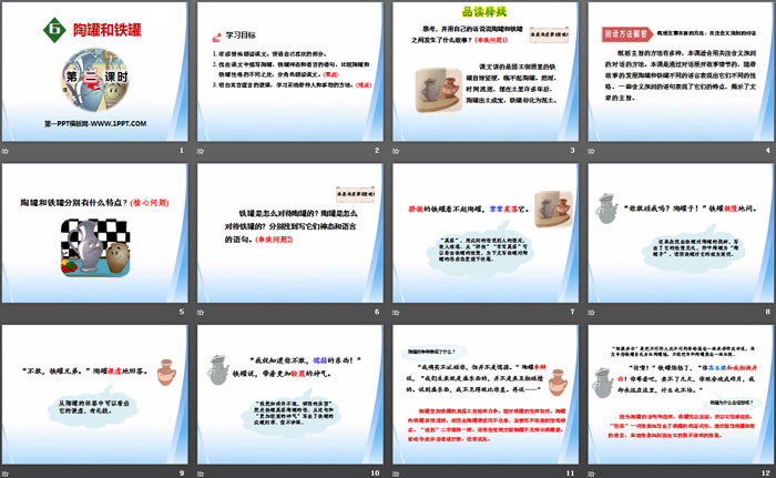 概括主旨的方法有多种,本课适合用关注含义深刻的对话的方法。本课是通过对话展开故事情节的,随着故事的发展陶罐和铁罐不同的语言表现出它们不同的性格,一些含义深刻的语句表现了它们的特点,揭示了文章的主旨。