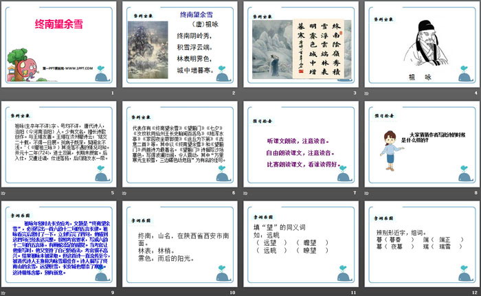 关键词:鄂教版五年级上册语文PPT课件免费下载,终南望余雪PPT下载,.PPT格式;