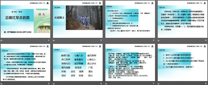关键词:鄂教版六年级下册语文PPT课件免费下载,沿着红军走的路PPT下载,.PPT格式;