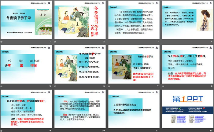 关键词:鄂教版六年级下册语文PPT课件免费下载,冬夜读书示子聿PPT下载,.PPT格式;