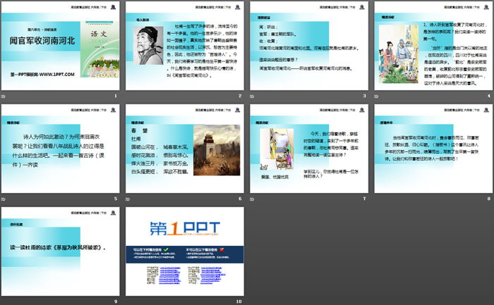 关键词:鄂教版六年级下册语文PPT课件免费下载,闻官军收河南河北PPT下载,.PPT格式;