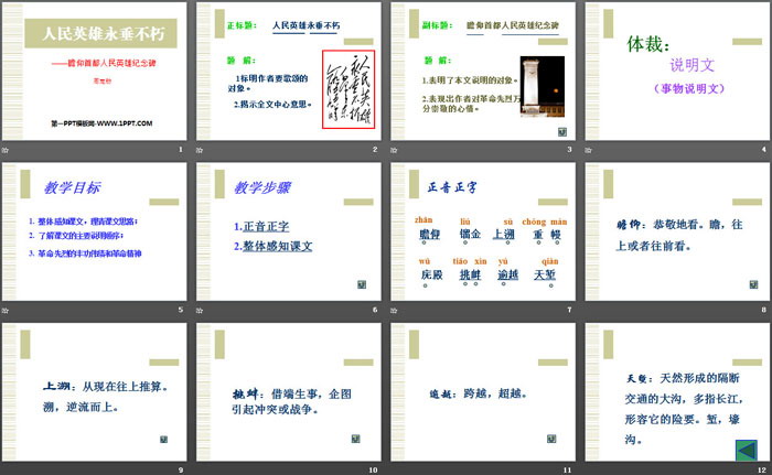 关键词:鄂教版八年级上册语文PPT课件免费下载,人民英雄永垂不朽瞻仰首都人民英雄纪念碑PPT下载,.PPT格式;
