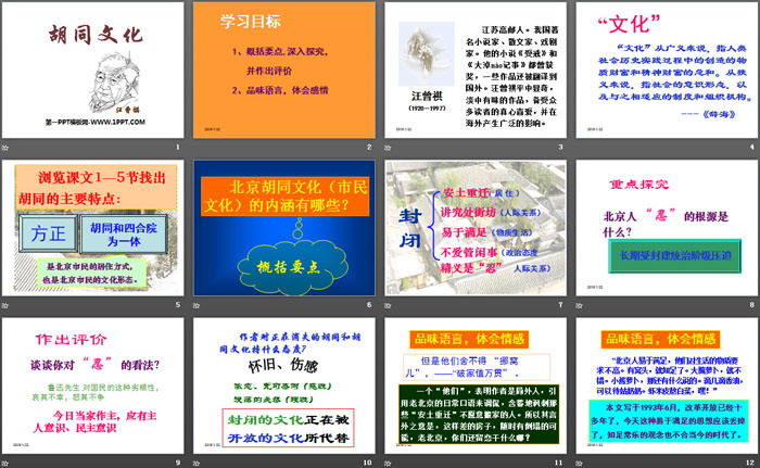 关键词:鄂教版九年级上册语文PPT课件免费下载,胡同文化PPT下载,.PPT格式;