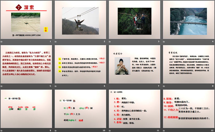 云南怒江大峡谷,被称为“东方大峡谷”,世界三大峡谷之一。峡谷的东面是被称为“万瀑千湖之山”的碧罗雪山,西部是中缅边境千里之防的高黎贡山,谷底是奔腾咆哮的怒江。怒江没有船,惊涛怒浪上小船无法横渡,两岸居民过江,从前主要靠“溜索”桥。那么,什么是溜索呢?请大家自由朗读课文,跟随作者的描述去感受这种让人惊心动魄的过河方式。