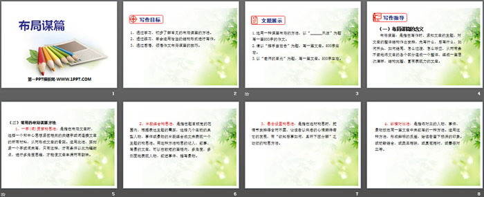 布局谋篇:是指在写作时,紧扣文章的主题,对文章的整体结构作出安排,先写什么,后写什么,如何开头,如何结尾,怎么过渡,怎么呼应,从而有条不紊地将文章的各个部分连成一个整体,组成一篇层次清晰、结构完整、富有表现力的文章。