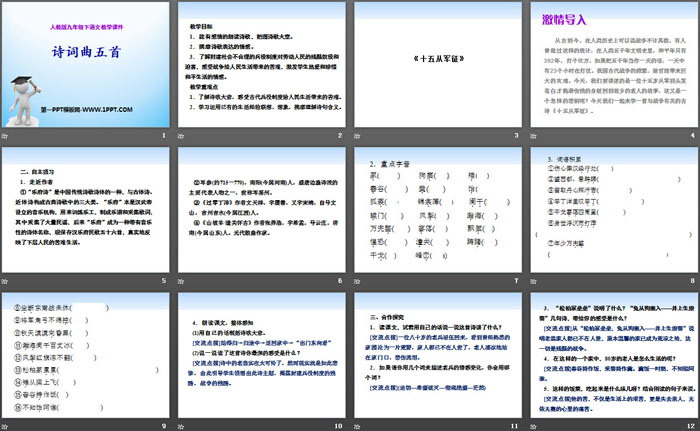 关键词:部编人教版九年级下册语文PPT课件免费下载,诗词曲五首PPT下载,十五从军征PPT下载,白雪歌送武判官归京PPT下载,南乡子登京口北固亭有怀PPT下载,过零丁洋PPT下载,山坡羊潼关怀古PPT下载,.PPT格式;
